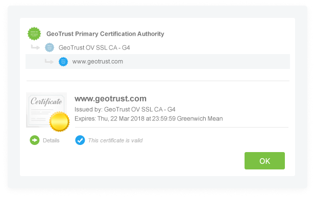 OV SSL ist ein Unternehmens-validiertes Zertifikat, welches Ihrer Website noch mehr Glaubwürdigkeit verleiht als ein Domain-validiertes Zertifikat. Es aktiviert das Browser-Vorhängeschloss und https und zeigt Ihren Kunden die Identität Ihres Unternehmens oder Ihrer Organisation. Website-Besucher können überprüfen, dass die Website von einem legitimen Unternehmen betrieben wird und, dass Ihnen die Sicherheit Ihrer Website und Ihrer Kunden wichtig ist.